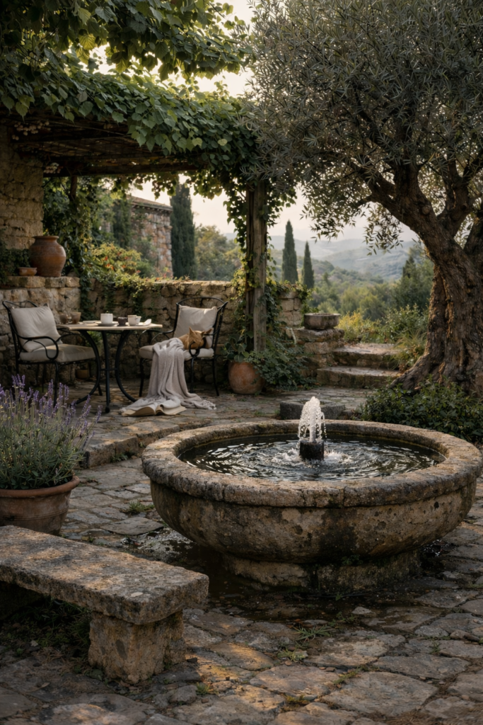 Elementy wodne – fontanny, kamienne misy, niewielkie baseny – nie są dodatkiem. Są jednym z najważniejszych elementów kompozycji. Nawet niewielka fontanna potrafi zmienić odbiór całego ogrodu bardziej niż kolejna roślina czy dekoracja.