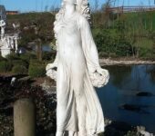 Ponadto starannie odwzorowane detale, takie jak falująca draperia oraz bogate motywy kwiatowe trzymane w dłoniach, podkreślają dekoracyjny charakter rzeźby i nawiązują do symboliki natury oraz rozkwitu. Dzięki temu posąg przyciąga uwagę i staje się wyrazistym elementem aranżacji.